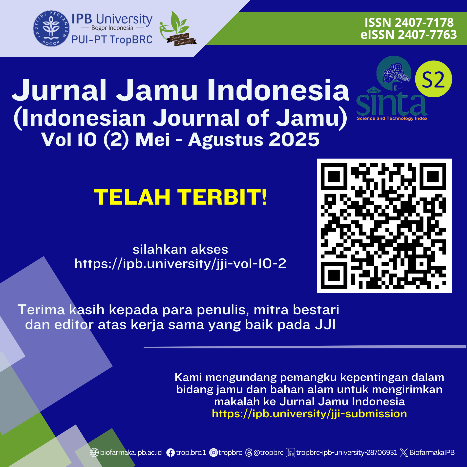 The latest edition of Jurnal Jamu Indonesia (JJI) Volume 10 Number 2, covering May–August 2025, is now available. This edition features up-to-date scientific articles highly relevant for researchers, academics, and practitioners in the field of jamu and traditional medicine.