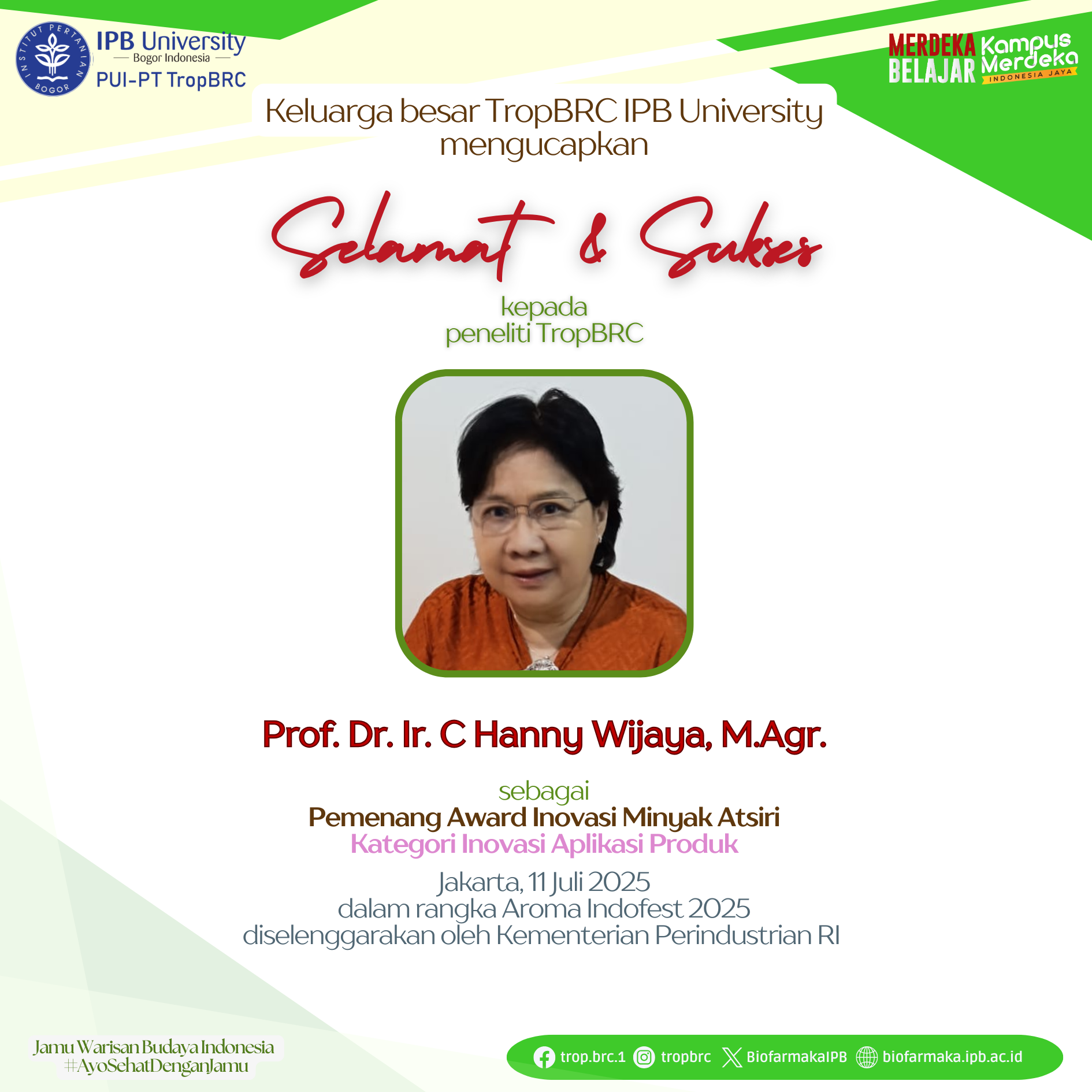 The Tropical Biopharmaca Research Center (TropBRC) of IPB University proudly extends its congratulations to Prof. Dr. Ir. C. Hanny Wijaya, M.Agr., one of its esteemed researchers, for receiving the Essential Oil Innovation Award in the Product Application Innovation category. This prestigious award was presented during Aroma Indofest 2025, organized by the Ministry of Industry of the Republic of Indonesia, on Friday, July 11, 2025, in Jakarta.