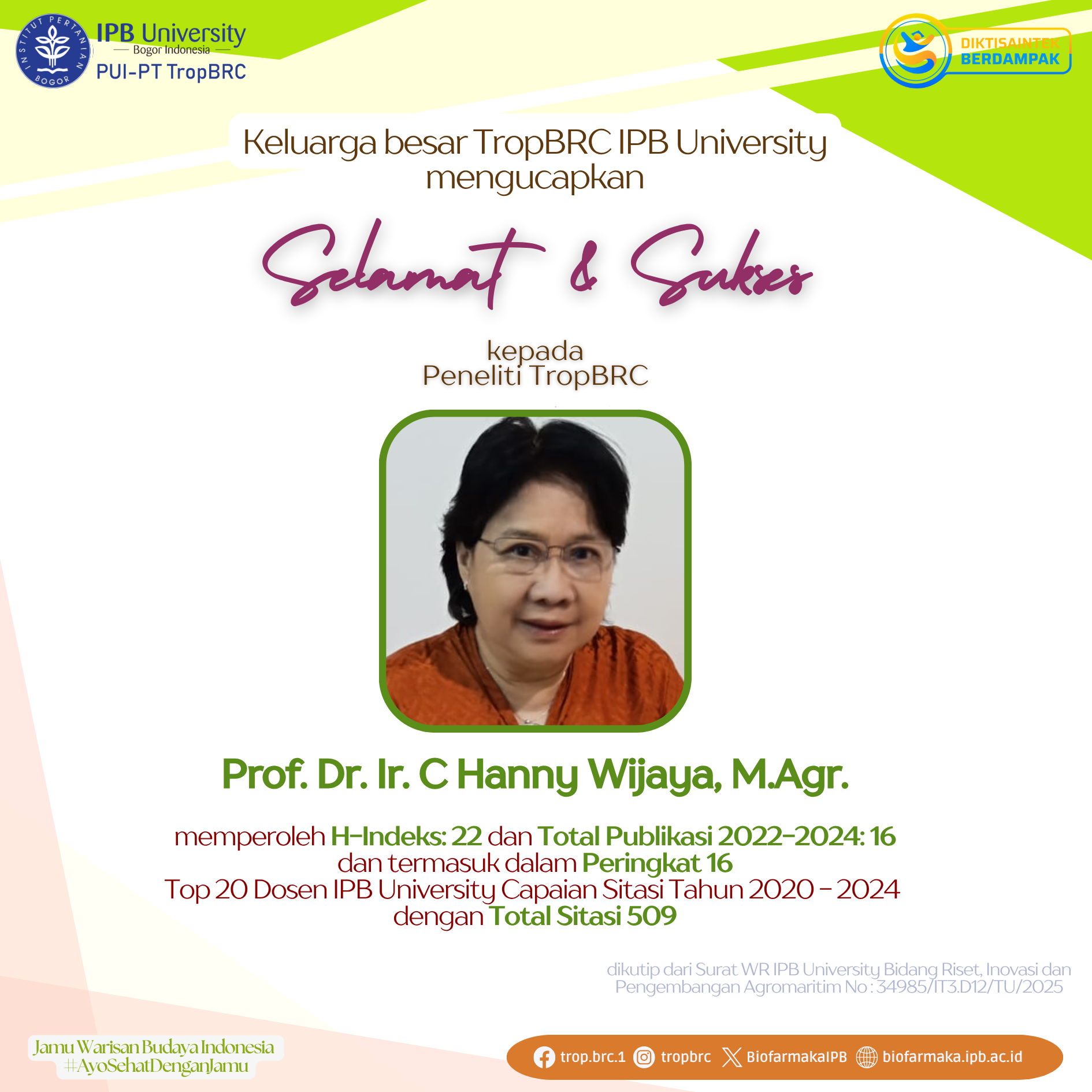 The Tropical Biopharmaca Research Center (TropBRC) of IPB University extends its warmest congratulations and best wishes to Prof. Dr. Ir. C Hanny Wijaya, M.Agr. for her outstanding academic accomplishments. She has achieved an H-Index of 22 and published 16 scientific works during the 2022–2024 period.