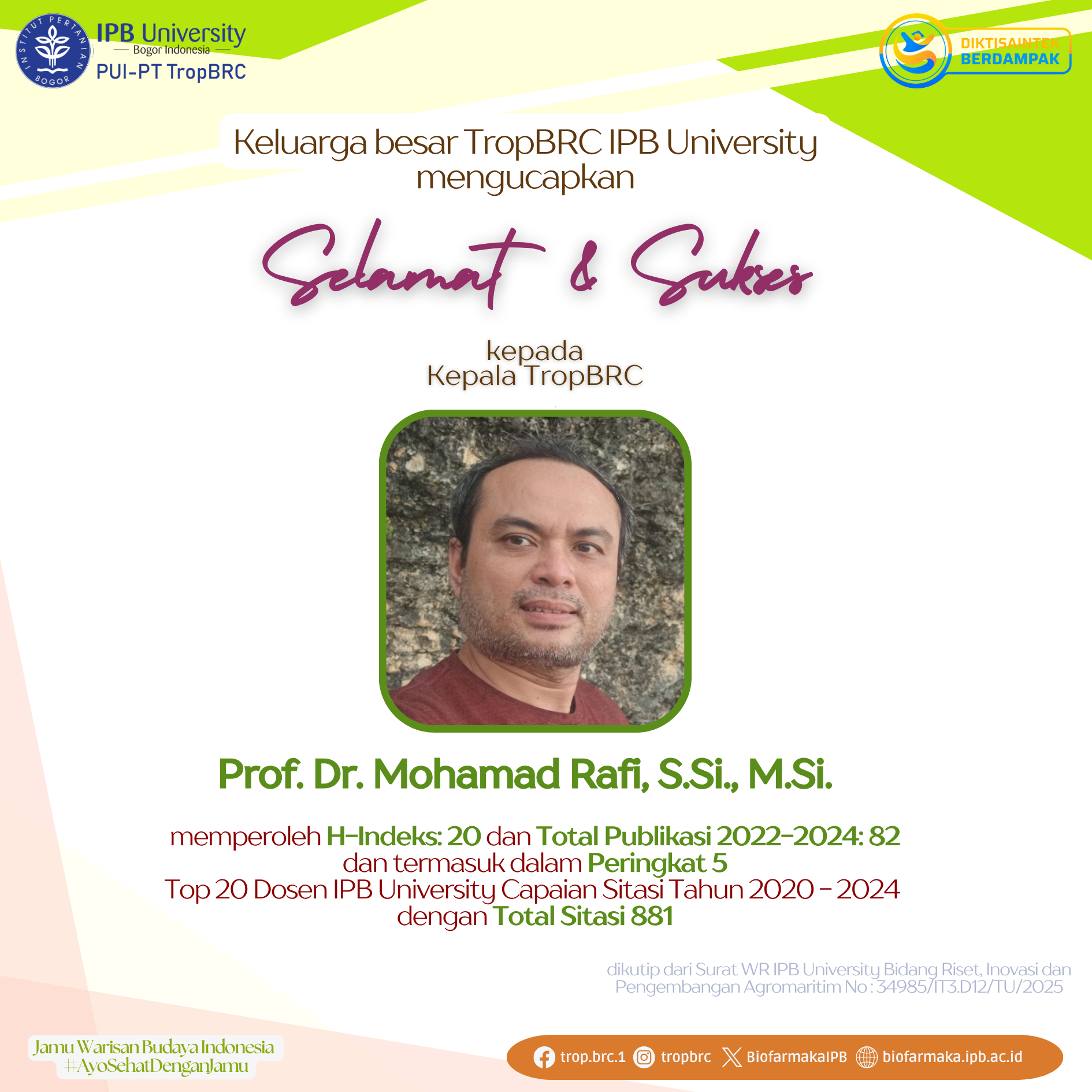 The Tropical Biopharmaca Research Center (TropBRC) of IPB University proudly extends its warmest congratulations to the Director of TropBRC, Prof. Dr. Mohamad Rafi, S.Si., M.Si., for his outstanding achievement in securing 5th place on the list of Top 20 IPB University Lecturers with the Highest Citation Achievements during the 2020–2024 period. This accomplishment stands as a testament to his active contributions to academia and research, particularly in the fields of biopharmaca and natural products.