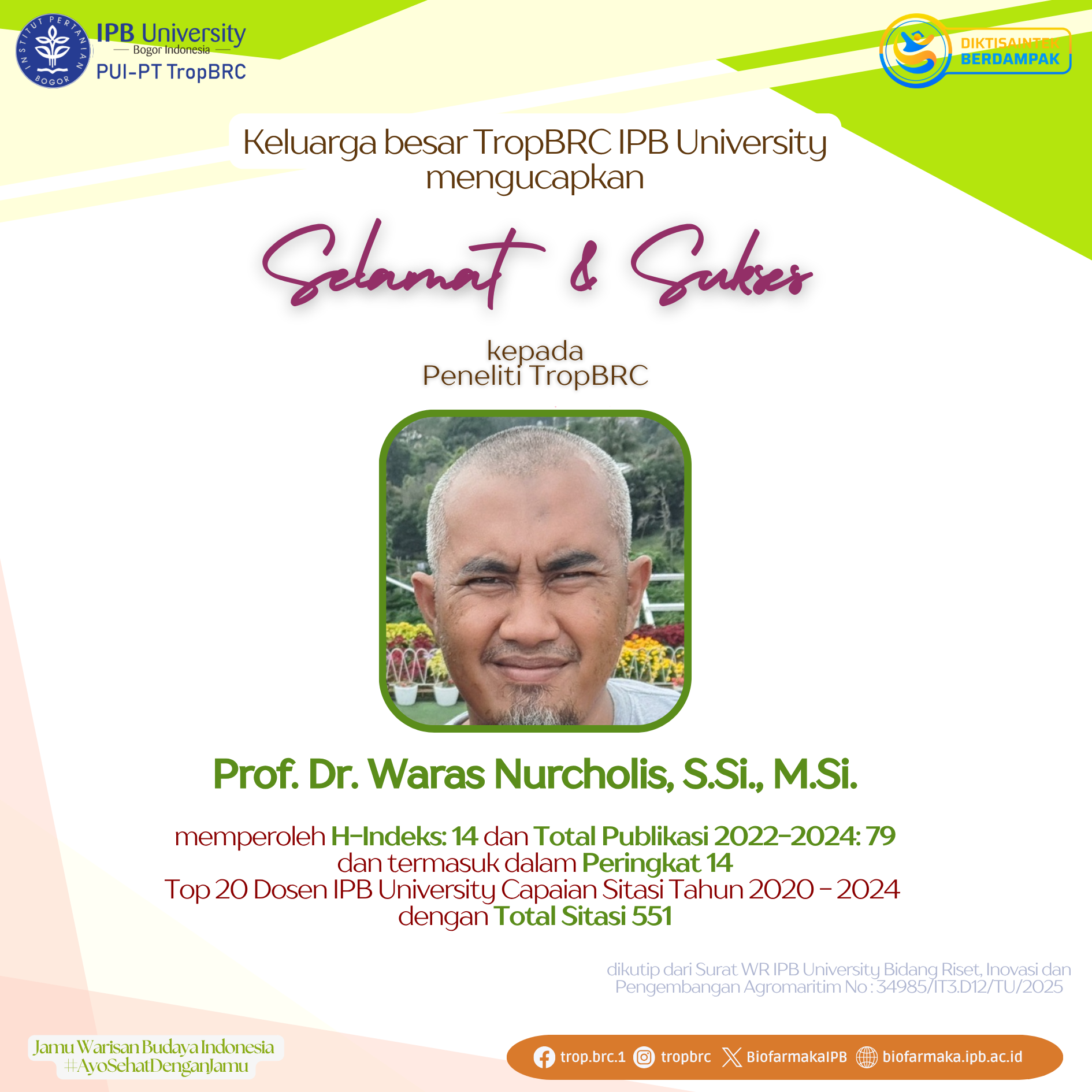 The Tropical Biopharmaca Research Center (TropBRC) of IPB University proudly extends its heartfelt congratulations to Prof. Dr. Waras Nurcholis, S.Si., M.Si. for his outstanding achievements in academia and research. He has recorded an H-Index of 14 and published 79 scientific works between 2022 and 2024.
