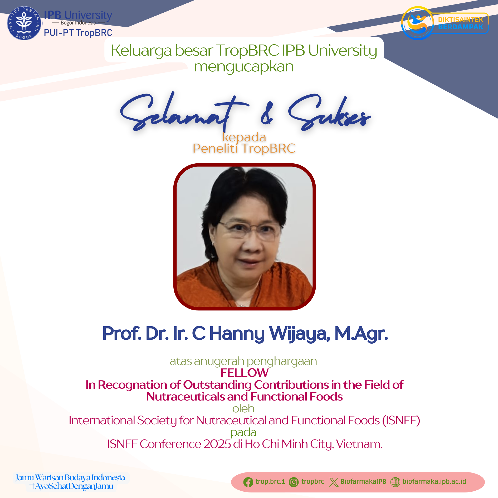 The Tropical Biopharmaca Research Center (TropBRC) LRI-PGK IPB University extends its congratulations and best wishes to C. Hanny Wijaya, Prof., Dr., Ir., M.Agr., for receiving the FELLOW in Recognition of Outstanding Contributions in the Field of Nutraceuticals and Functional Foods award from the International Society for Nutraceutical and Functional Foods (ISNFF) 2025. This year, ISNFF is held on 18–20 September 2025 in Ho Chi Minh City, Vietnam.