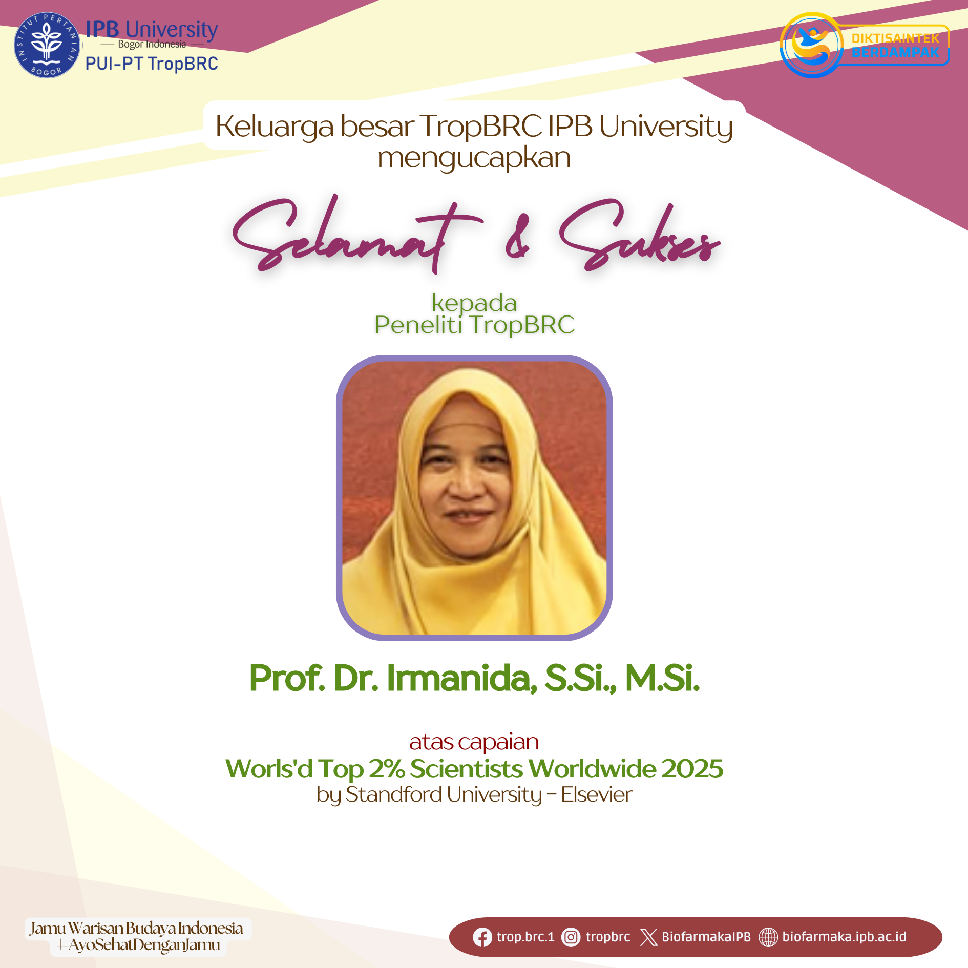 The big family of TropBRC IPB University extends our congratulations and best wishes to TropBRC Researcher, Prof. Dr. Irmanida, S.Si., M.Si., for being recognized among the World’s Top 2% Scientists Worldwide 2025 by Stanford University–Elsevier.