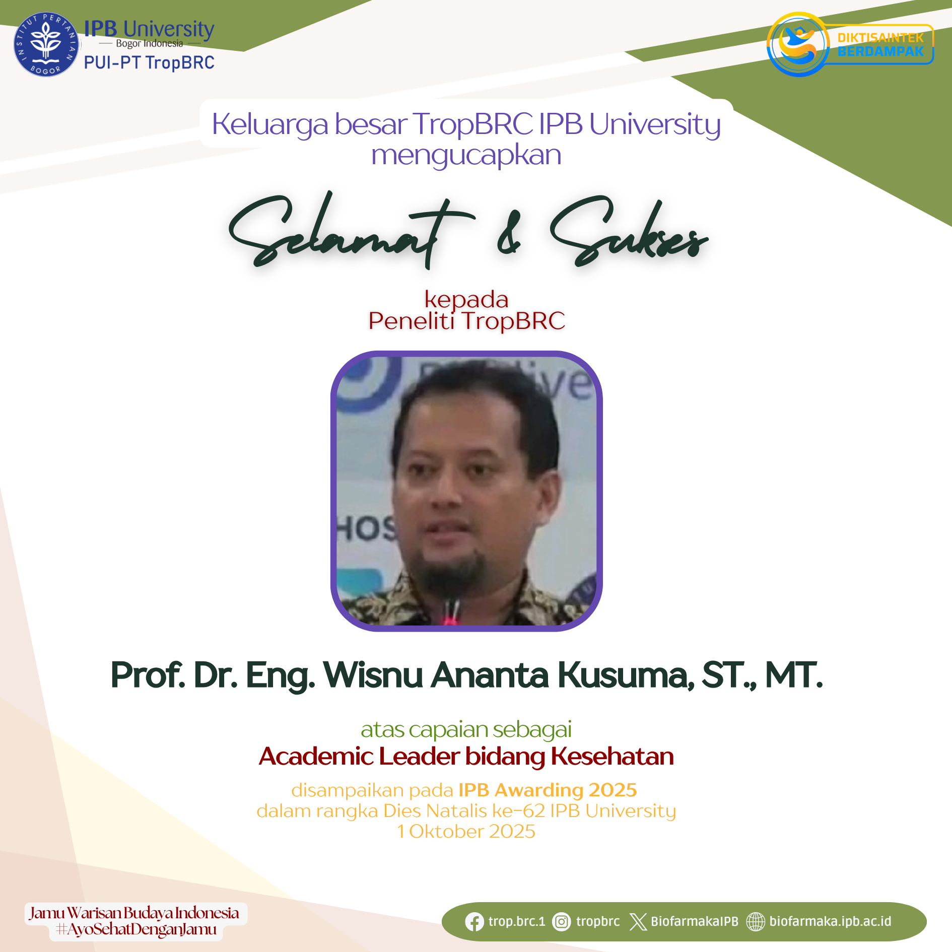 The big family of TropBRC IPB University extends our congratulations and best wishes to TropBRC Researcher, Prof. Dr. Irmanida, S.Si., M.Si., for being recognized as Lecturer with the Best Publication Performance at the IPB Awarding 2025, held in celebration of the 62nd Dies Natalis of IPB University, October 1, 2025.