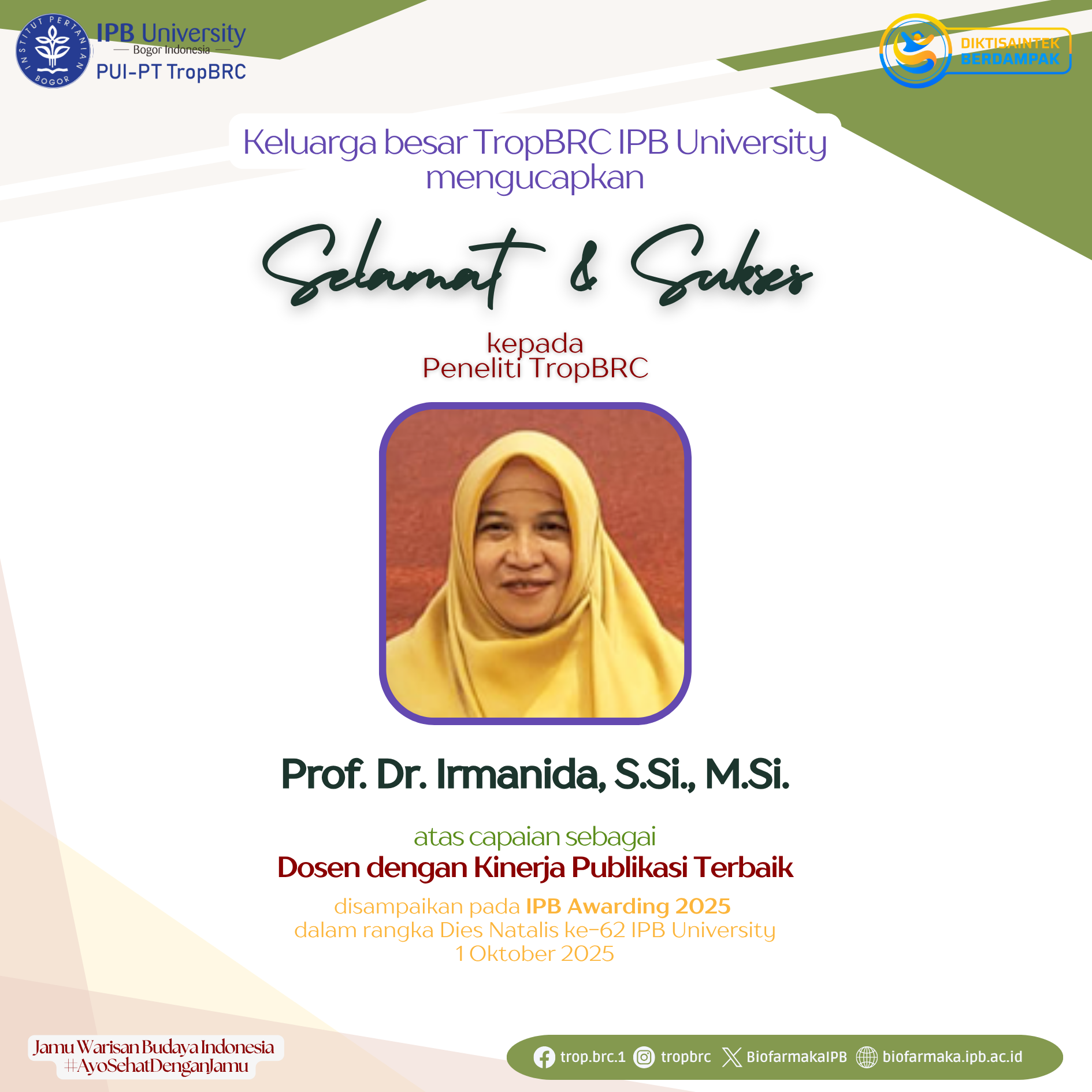 The big family of TropBRC IPB University extends our congratulations and best wishes to TropBRC Researcher, Prof. Dr. Irmanida, S.Si., M.Si., for being recognized as Lecturer with the Best Publication Performance at the IPB Awarding 2025, held in celebration of the 62nd Dies Natalis of IPB University, October 1, 2025.