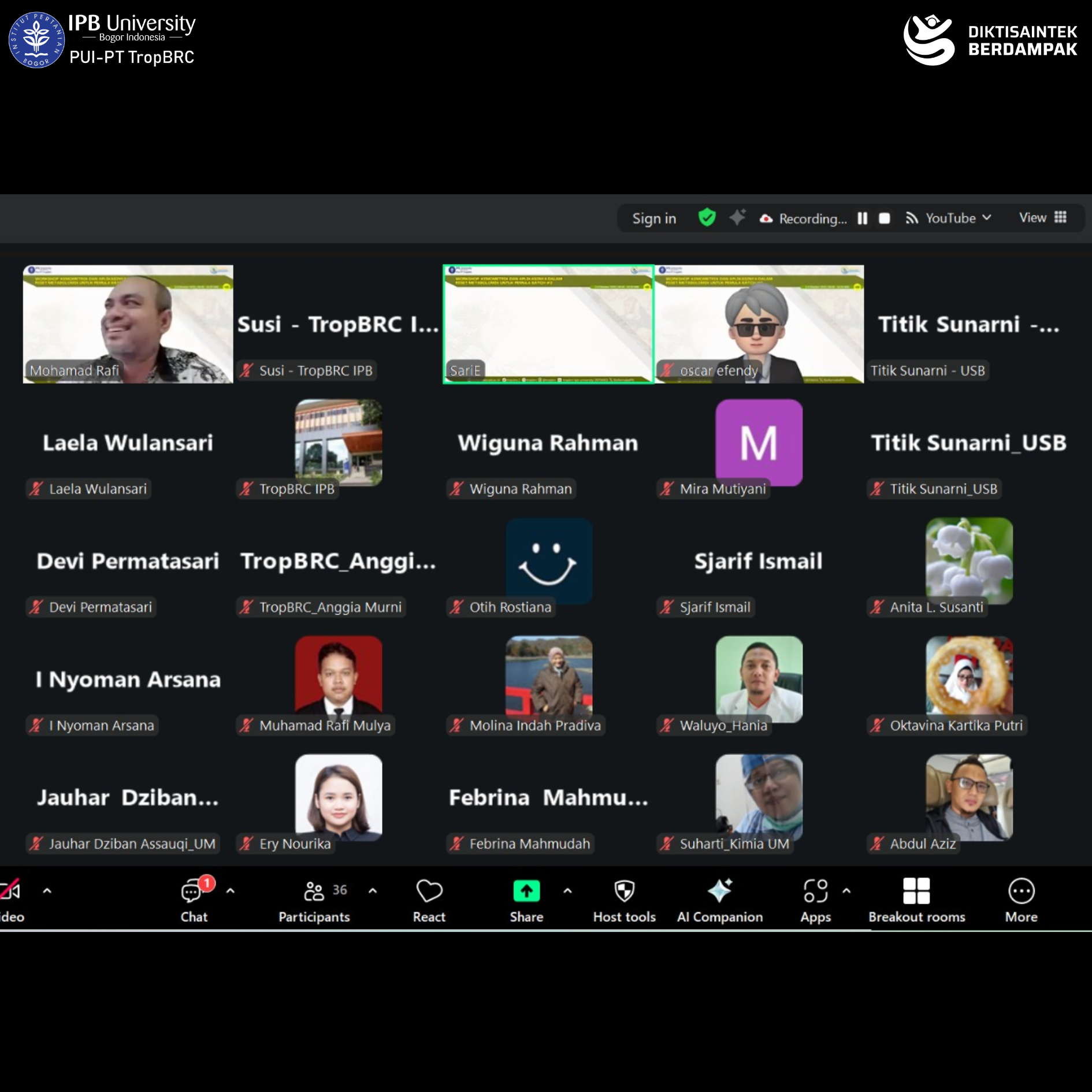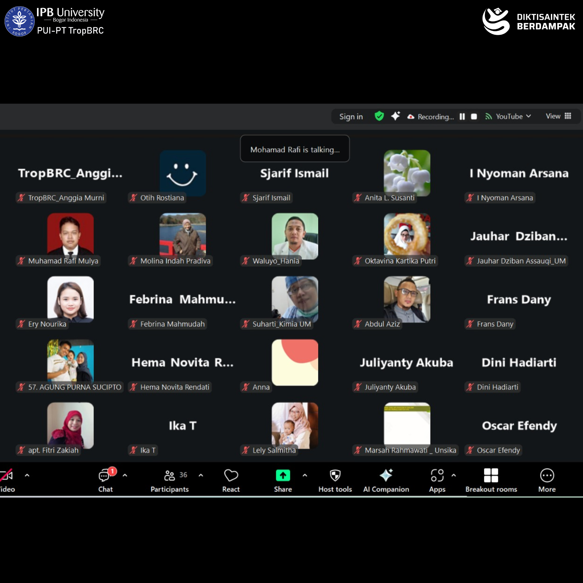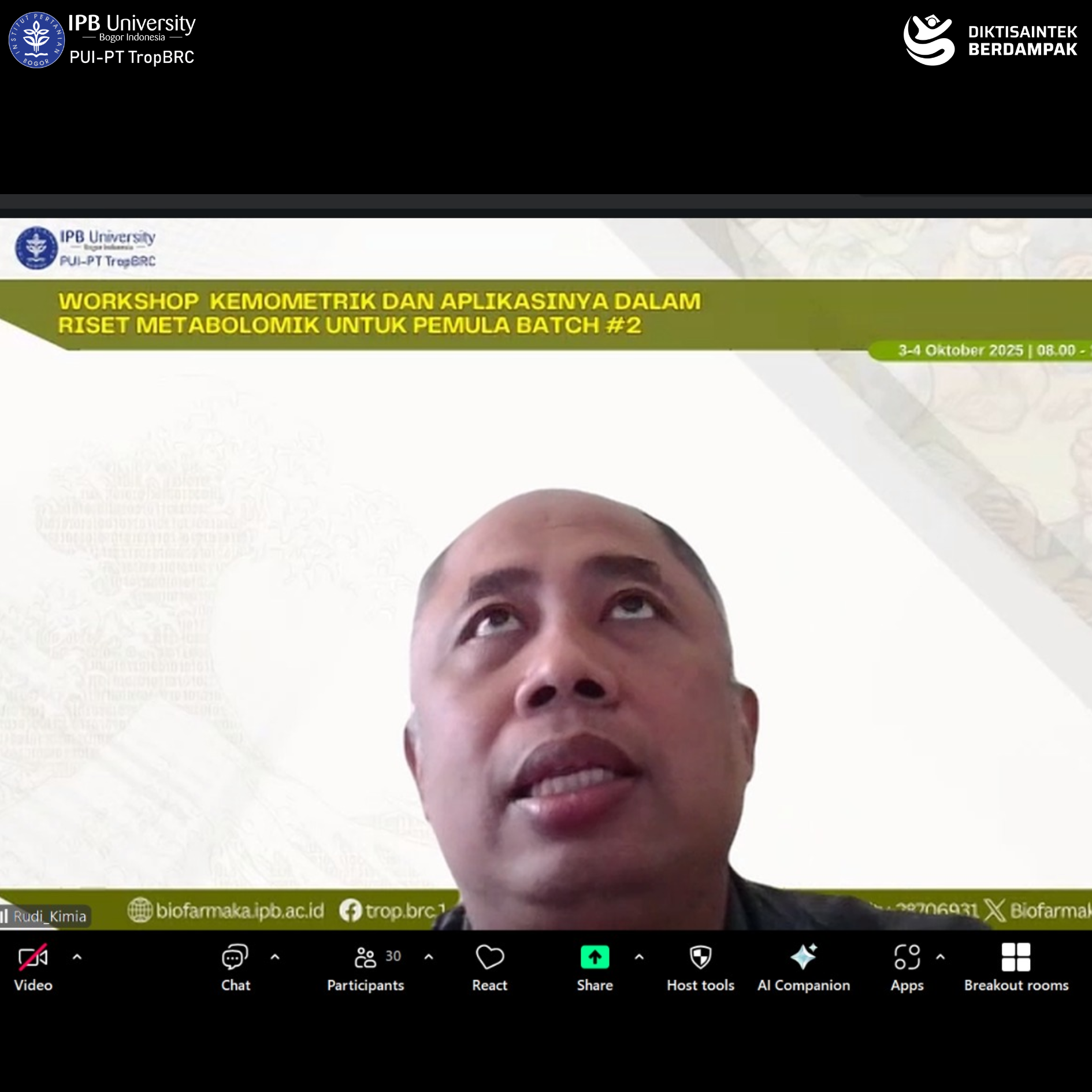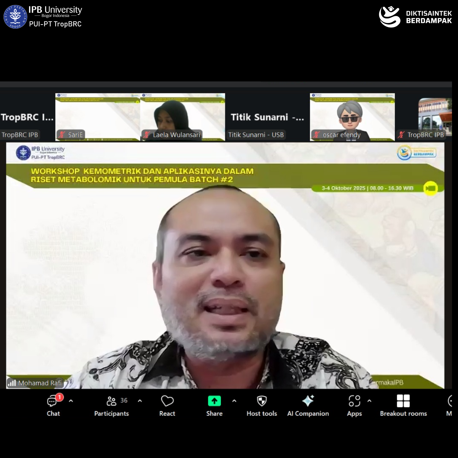 The Tropical Biopharmaca Research Center (TropBRC) LRI-PGK IPB University successfully held the Workshop on Chemometrics in Metabolomics Research for Beginners Batch #2 on October 3–4, 2025. The workshop, opened by the Secretary of TropBRC, Dr. apt. Siti Sa’diah, M.Si., was attended by 31 participants from various institutions across Indonesia. This activity aimed to introduce the basic concepts of chemometrics and its applications in metabolomics research, while strengthening the research capacity in the field of tropical biopharmaca.