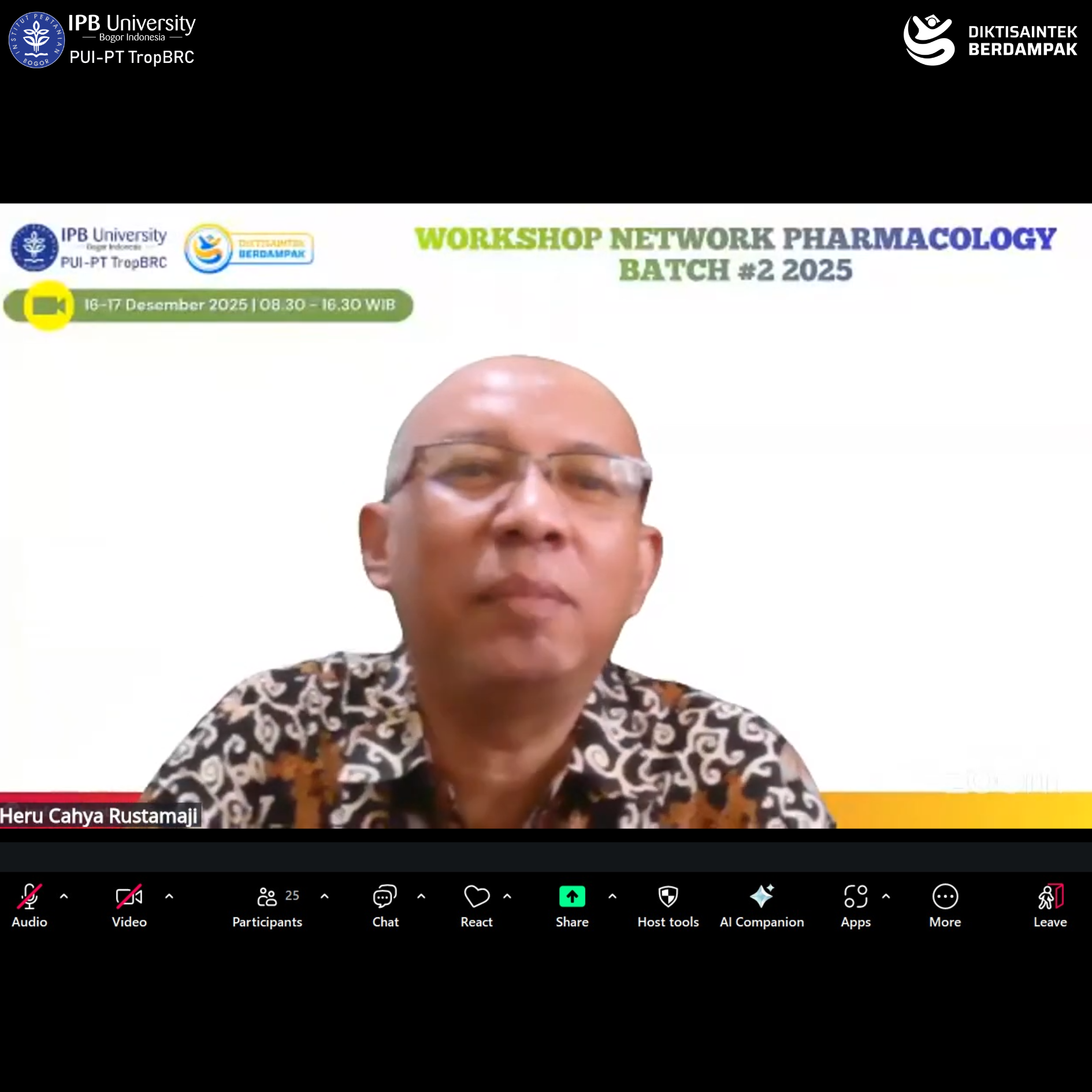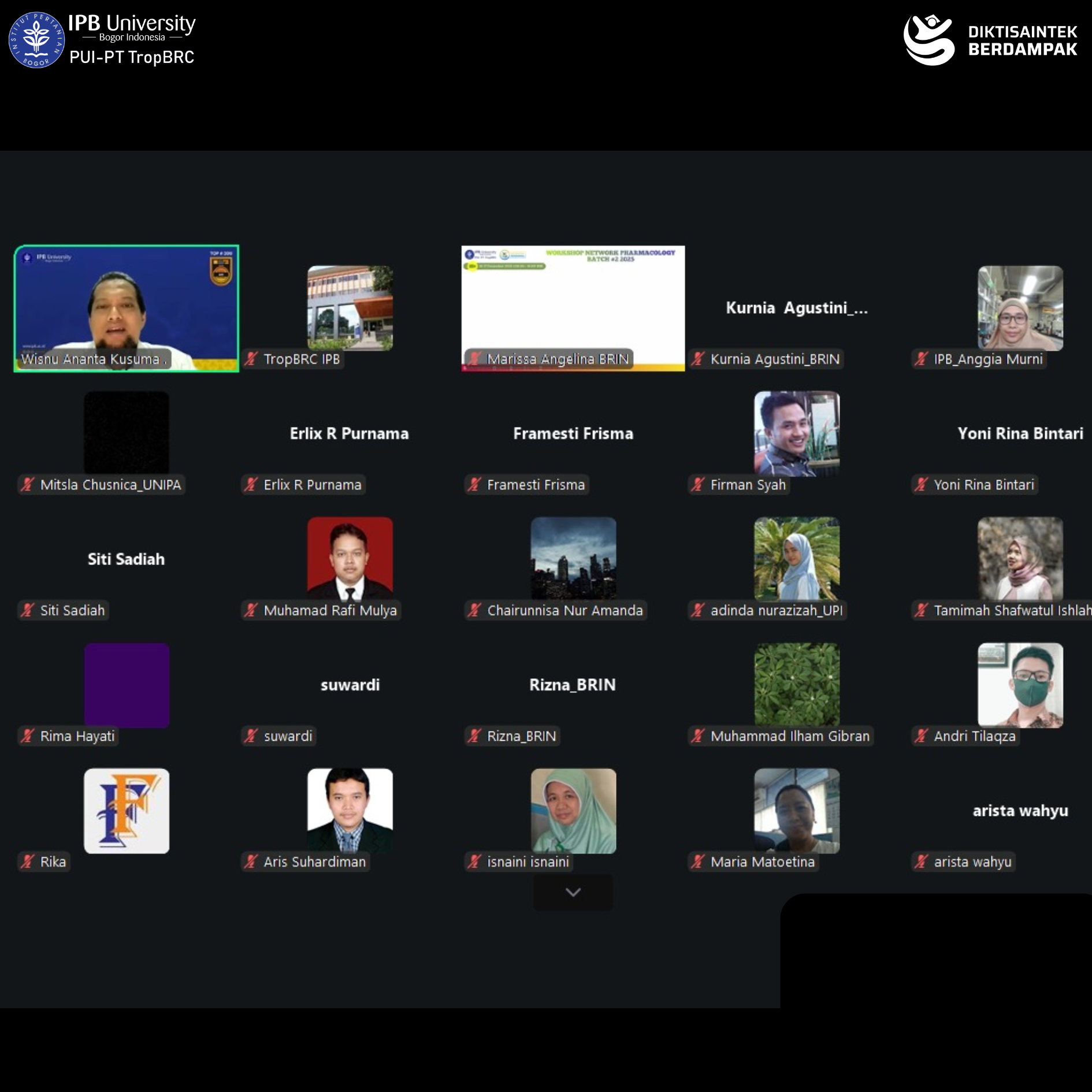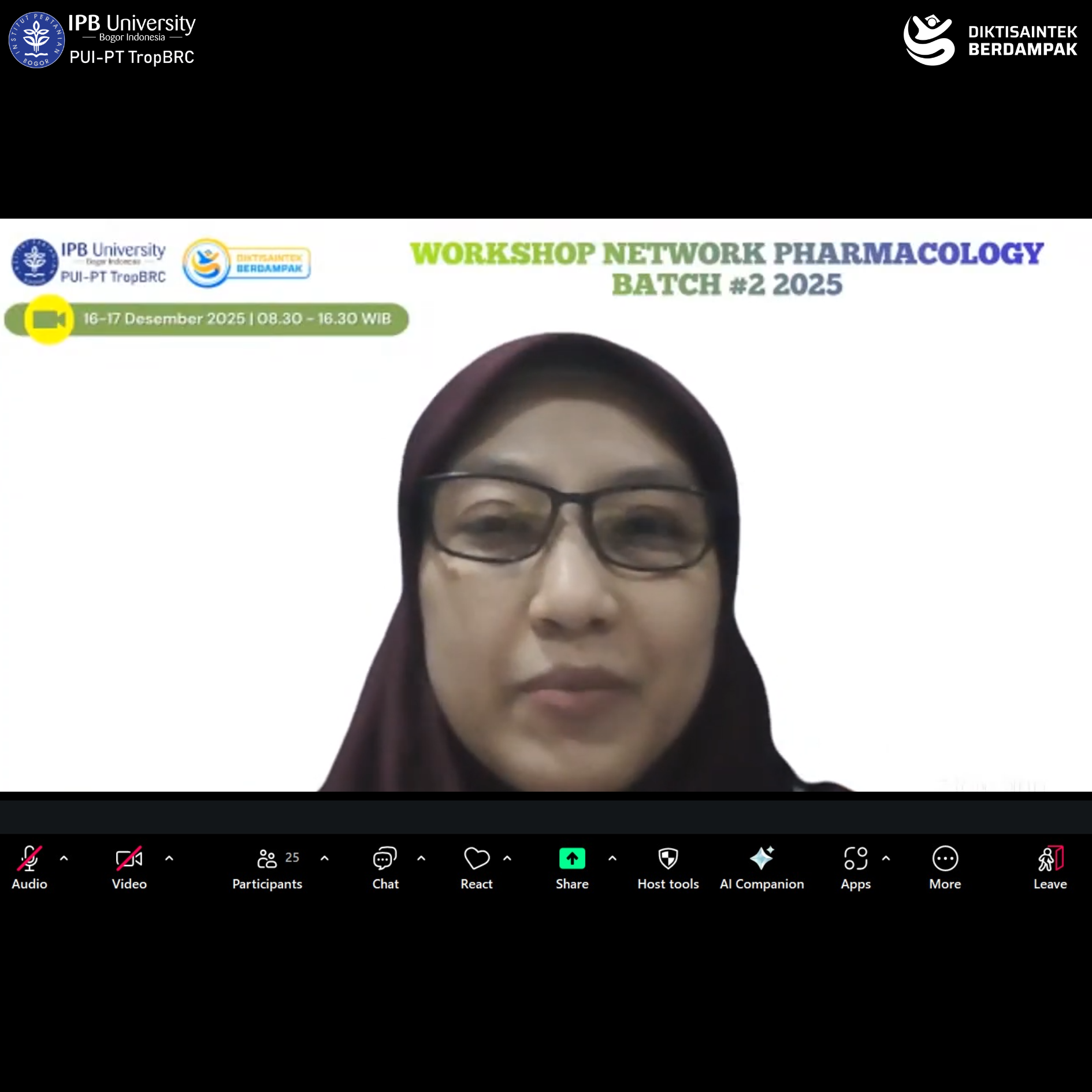 The Tropical Biopharmaca Studies (TropBRC), LRI-PGK IPB University, once again organized the Network Pharmacology Workshop 2025 Batch #2 on Tuesday–Wednesday, December 16–17, 2025, conducted online via Zoom Meeting. The workshop was officially opened by the Secretary of TropBRC, Dr. apt. Siti Sa’diah, M.Si., and was attended by 31 participants from various universities, research institutions, and health-related organizations across Indonesia, including the National Research and Innovation Agency (BRIN), Universitas Gadjah Mada, Universitas Brawijaya, Universitas Negeri Yogyakarta, Universitas Lambung Mangkurat, and TropBRC IPB University.