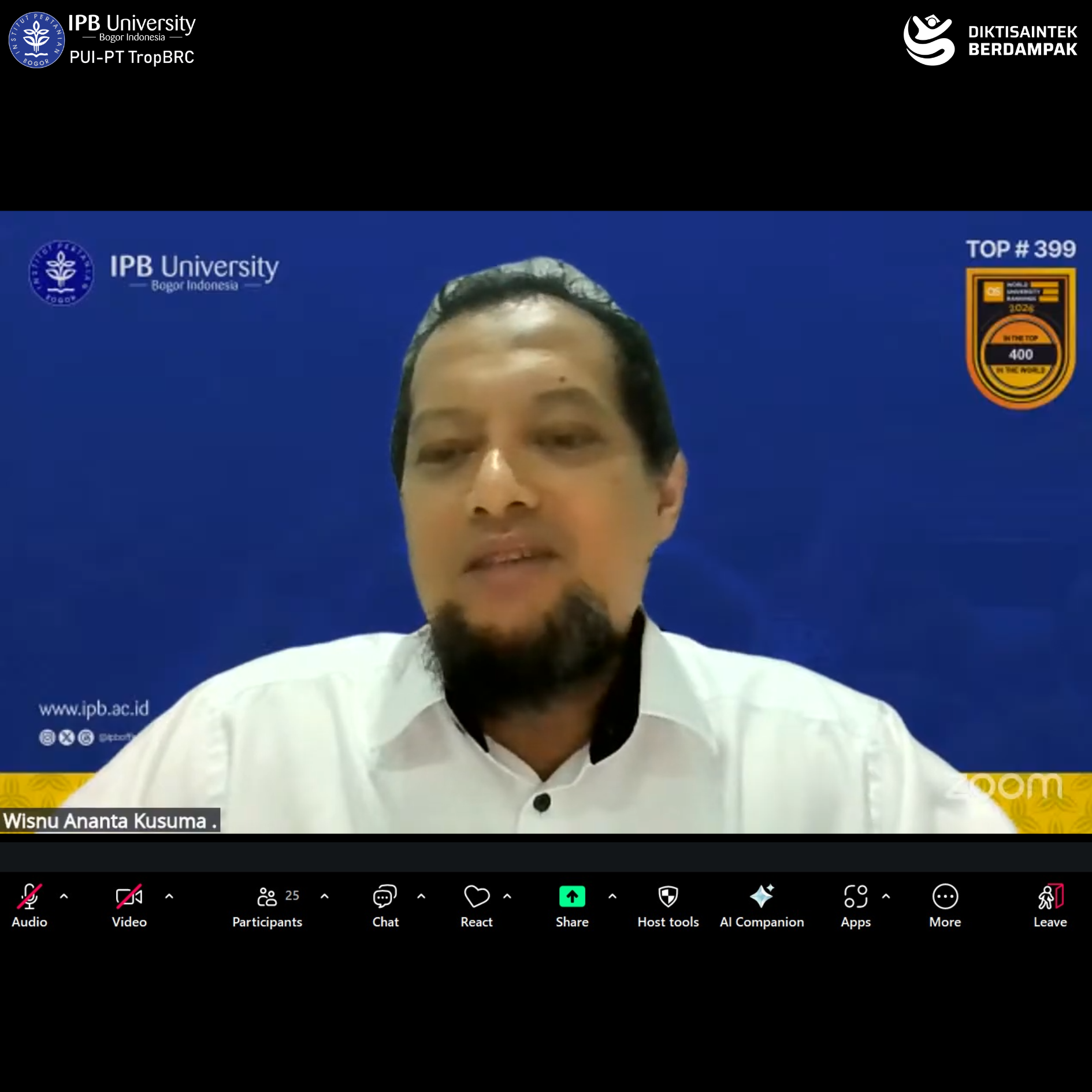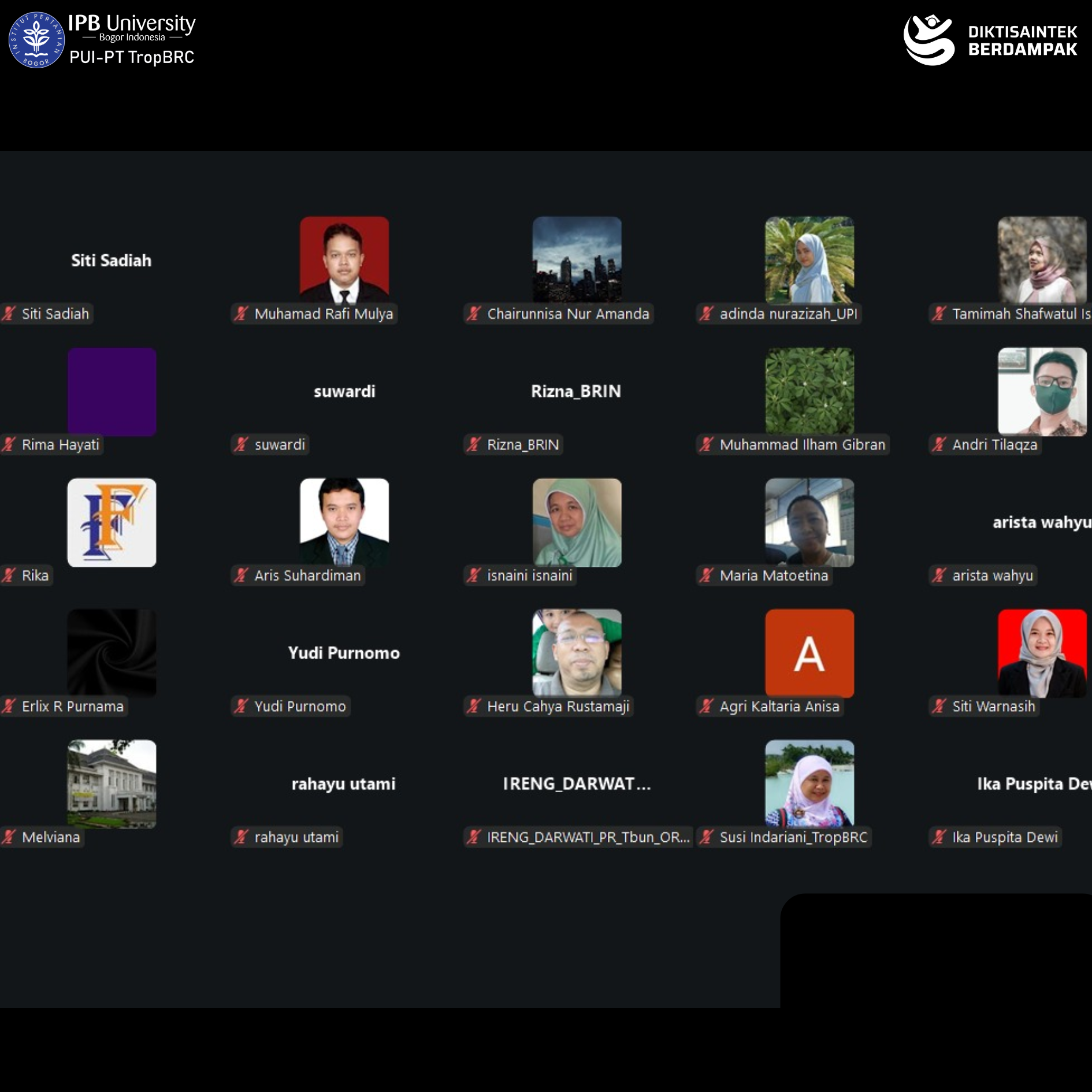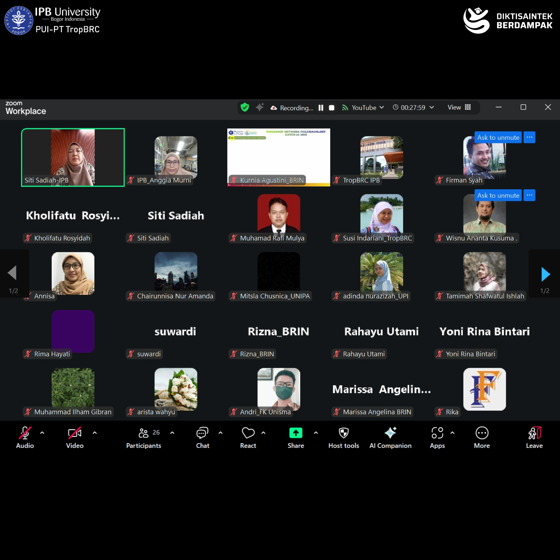 The Tropical Biopharmaca Studies (TropBRC), LRI-PGK IPB University, once again organized the Network Pharmacology Workshop 2025 Batch #2 on Tuesday–Wednesday, December 16–17, 2025, conducted online via Zoom Meeting. The workshop was officially opened by the Secretary of TropBRC, Dr. apt. Siti Sa’diah, M.Si., and was attended by 31 participants from various universities, research institutions, and health-related organizations across Indonesia, including the National Research and Innovation Agency (BRIN), Universitas Gadjah Mada, Universitas Brawijaya, Universitas Negeri Yogyakarta, Universitas Lambung Mangkurat, and TropBRC IPB University.