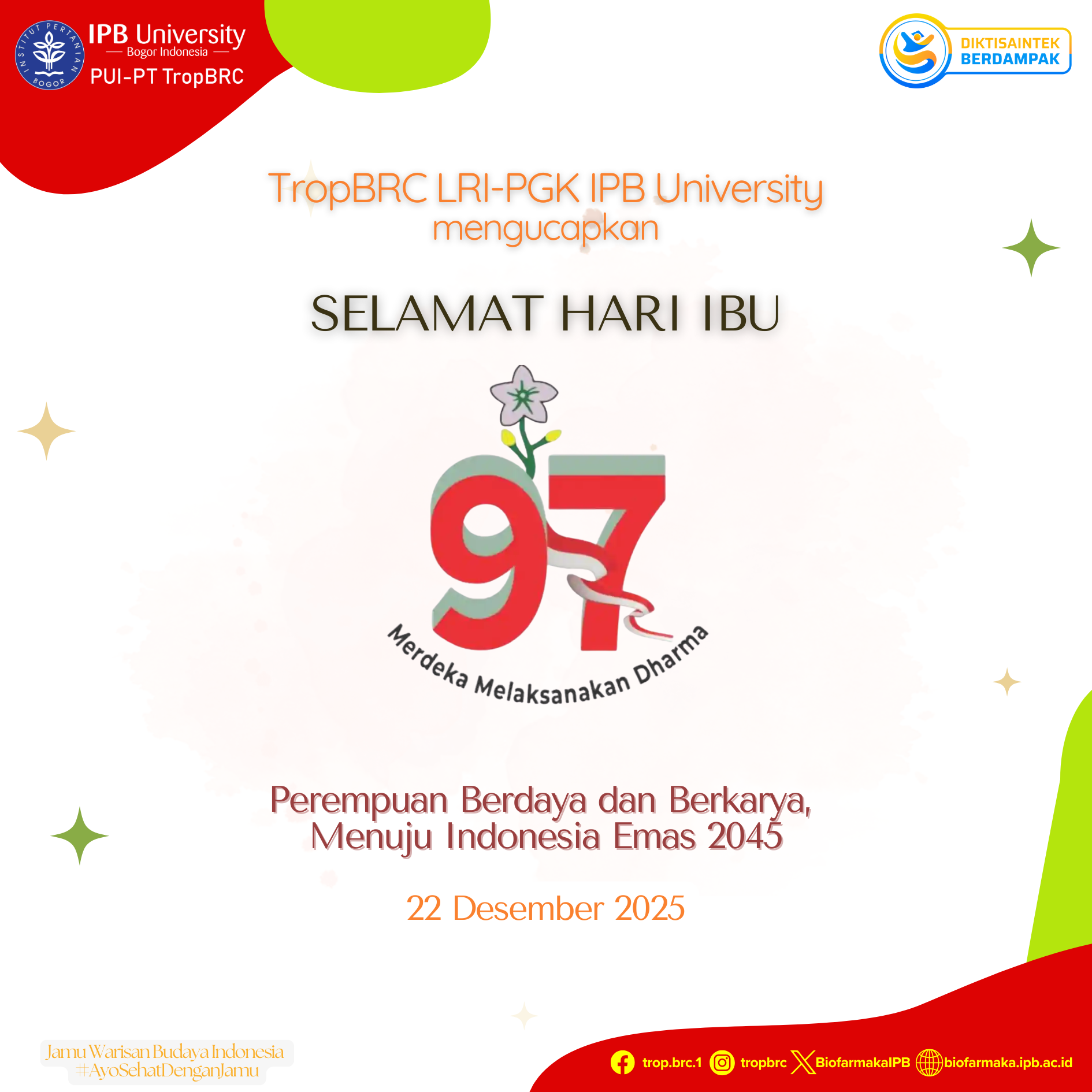 The Tropical Biopharmaca Research Center (TropBRC), LRI-PGK IPB University, extends its warmest wishes on Mother’s Day 2025. This occasion serves as a reflection on the strategic role of Indonesian women as empowered individuals who create, contribute, and play a vital role in families, communities, and national development. In line with the theme “Empowered and Creative Women Toward Indonesia Emas 2045” and the spirit of Merdeka Melaksanakan Dharma, mothers continue to be a source of inspiration, strength, and exemplary values in nurturing future generations and advancing Indonesia’s sustainable progress.