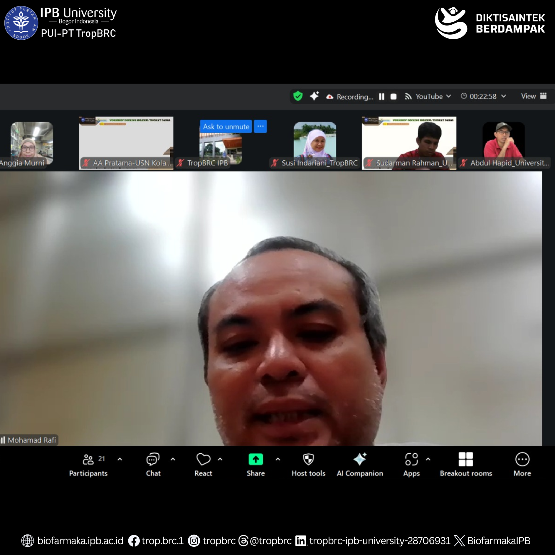 The Tropical Biopharmaca Research Center (TropBRC), IPB University, organized a Basic Molecular Docking Workshop over two days, Friday–Saturday, February 13–14, 2026, conducted online via Zoom Meeting. The workshop was specifically designed for participants who aimed to understand and practice molecular docking techniques from the fundamental level through a hands-on and fully practical approach. This method enabled participants to gain not only theoretical knowledge but also direct experience in molecular computation.